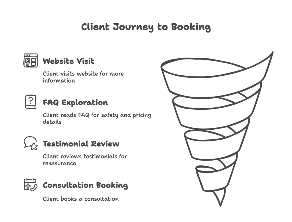 For example, a client might find you on Instagram, visit your website to learn about your services, read reviews, check pricing or FAQ, and then book a consultation.
